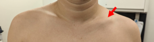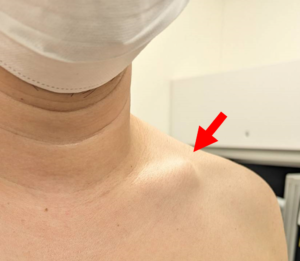 受傷晩期(=慢性期)では正常な骨の形状が変化(変形治癒:写真)し、Tentingによる美容上の問題が残ります。また変形治癒に際し、鎖骨が短縮すると肩幅が狭くなり、肩関節の機能が低下する場合があります。