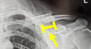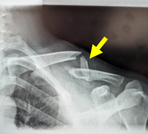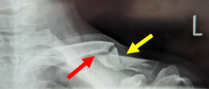 写真:高度の転位と第三骨片(黄矢印)を伴う鎖骨骨幹部骨折、患者より提供