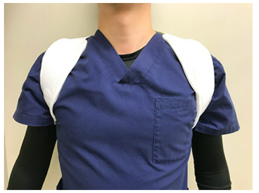 写真:専用治療器具である鎖骨バンドによる保存治療(白い帯が鎖骨バンド)日本整形外科学会HPより抜粋